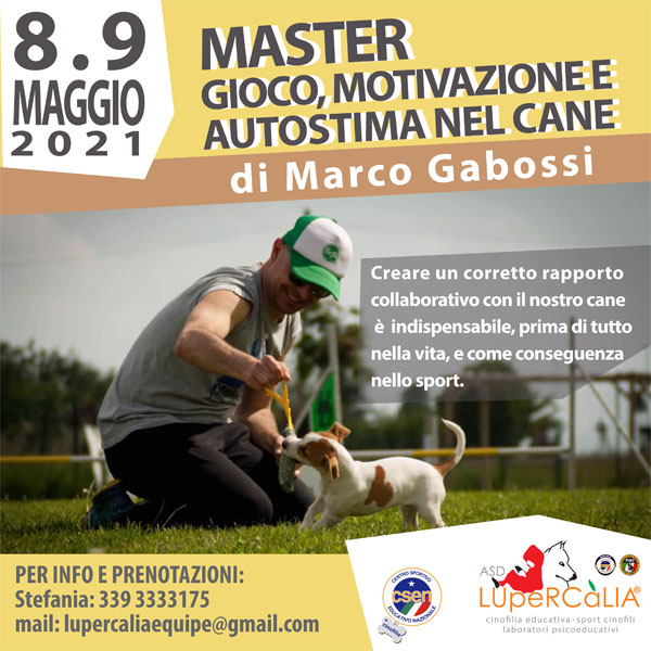 A.s.d. Lupercalia presenta il Master “Gioco, motivazione e autostima del cane. Di Marco Gabossi. Uno stage prettamente pratico con lavoro sul campo, personalizzato, dove si lavora direttamente sulle necessità del binomio, per chi ha difficoltà a rapportarsi, chi gioca in maniera non troppo corretta, chi ha delle necessità di motivazione sportiva. Tutto con la finalità di migliorare l’interazione ed il rapporto tra cane e conduttore, aumentare l’autostima, anche a favore di una prestazione sportiva.